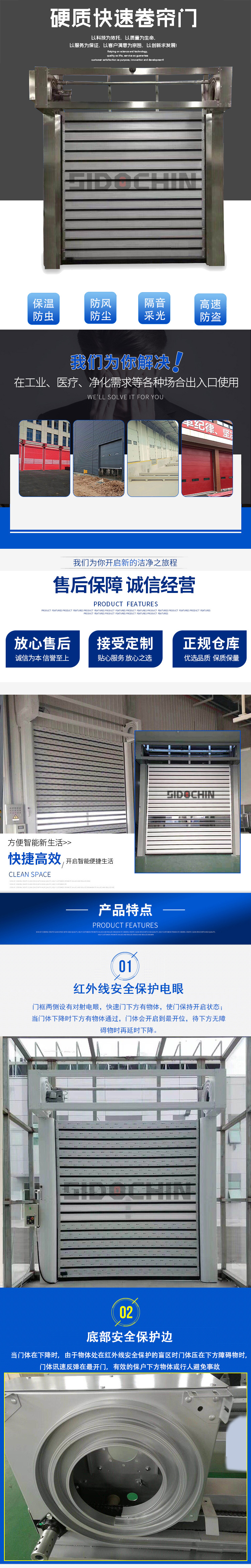 渦輪硬質快速門——集保溫、節能、密封、高效、抗風、環保于一身的新型金屬工業門,開啟速度快,安全性高,適用于需要頻繁高速啟閉的物流通道、倉儲、恒溫廠房、冷庫等,以及北方需要抗風保溫的廠房大門、地下車庫門等。